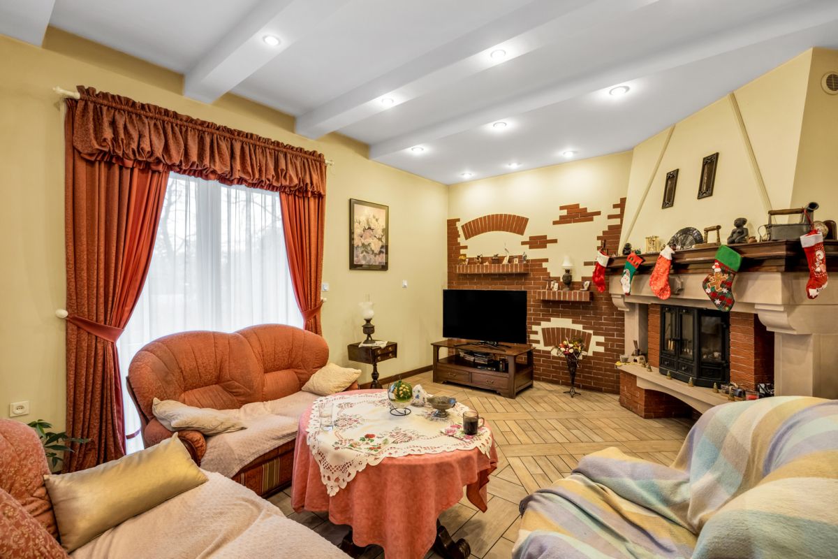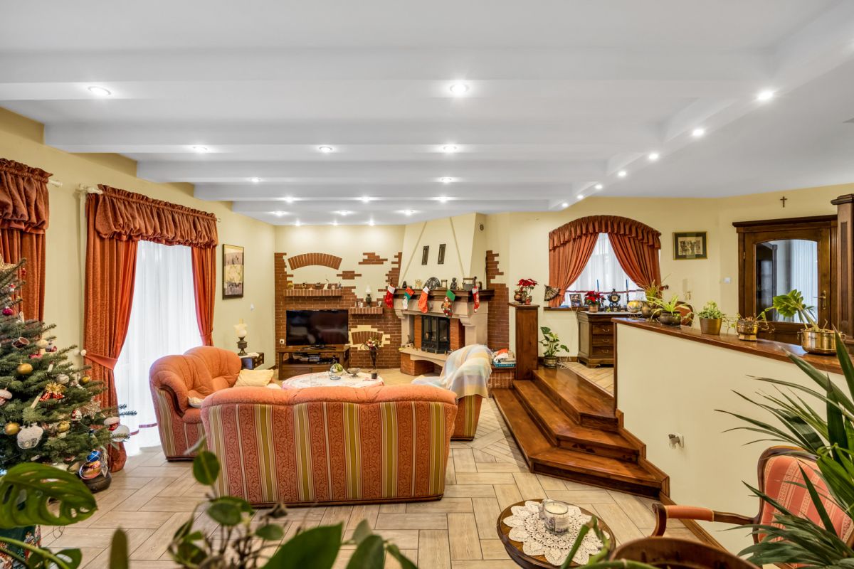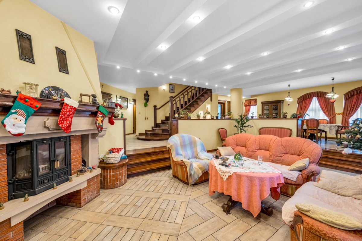 - Przestronny salon z kominkiem z wyjściem na taras, drewniany parkiet i terakota [29 m²]