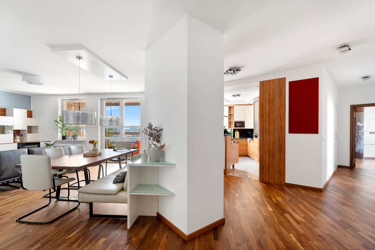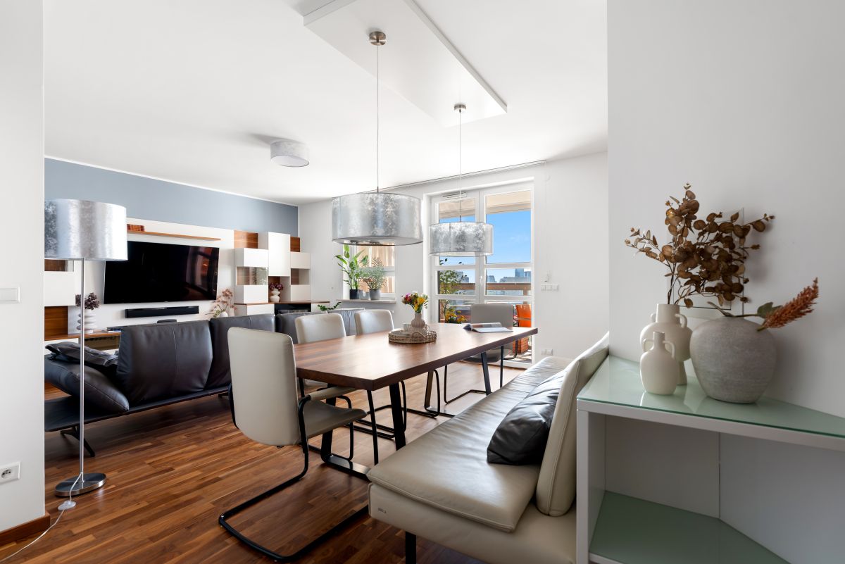 - Salon z jadalnią i wyjściem na przeszklony balkon z widokiem na panoramę Warszawy