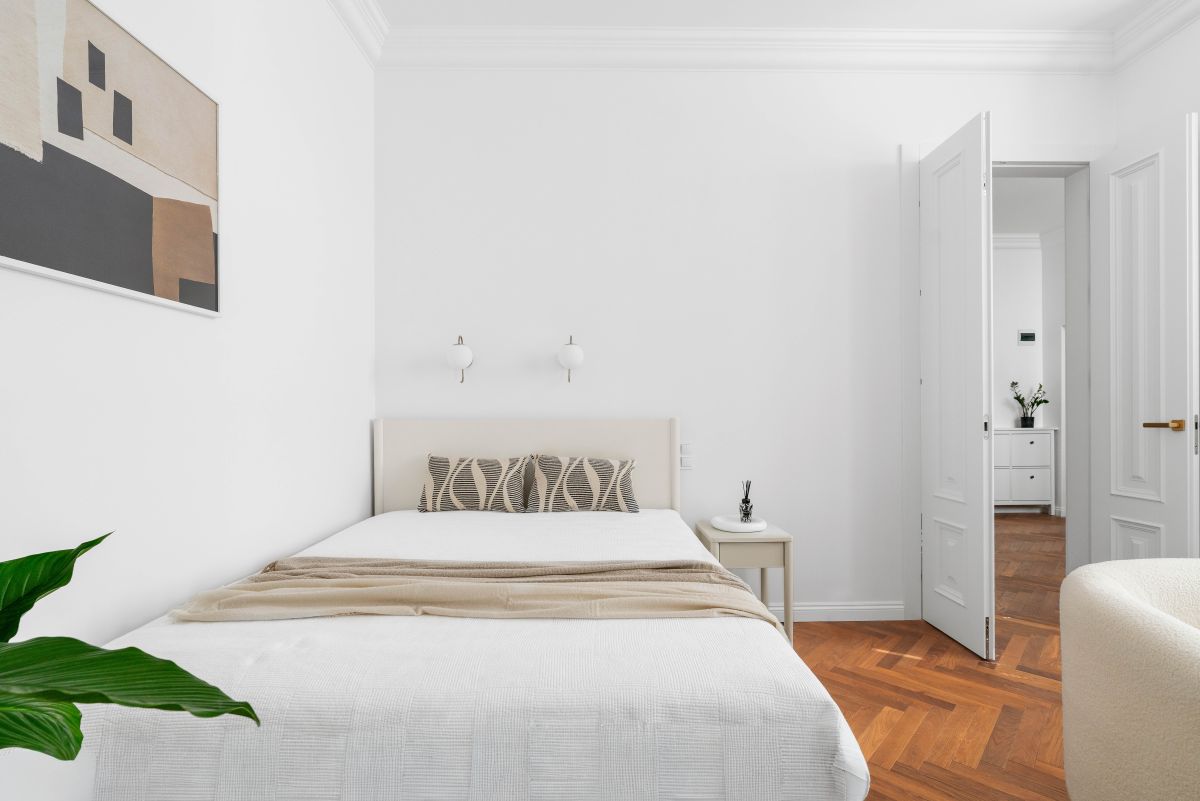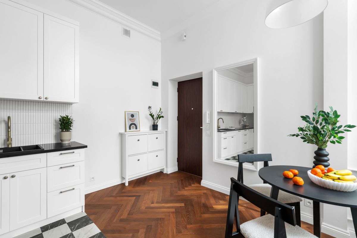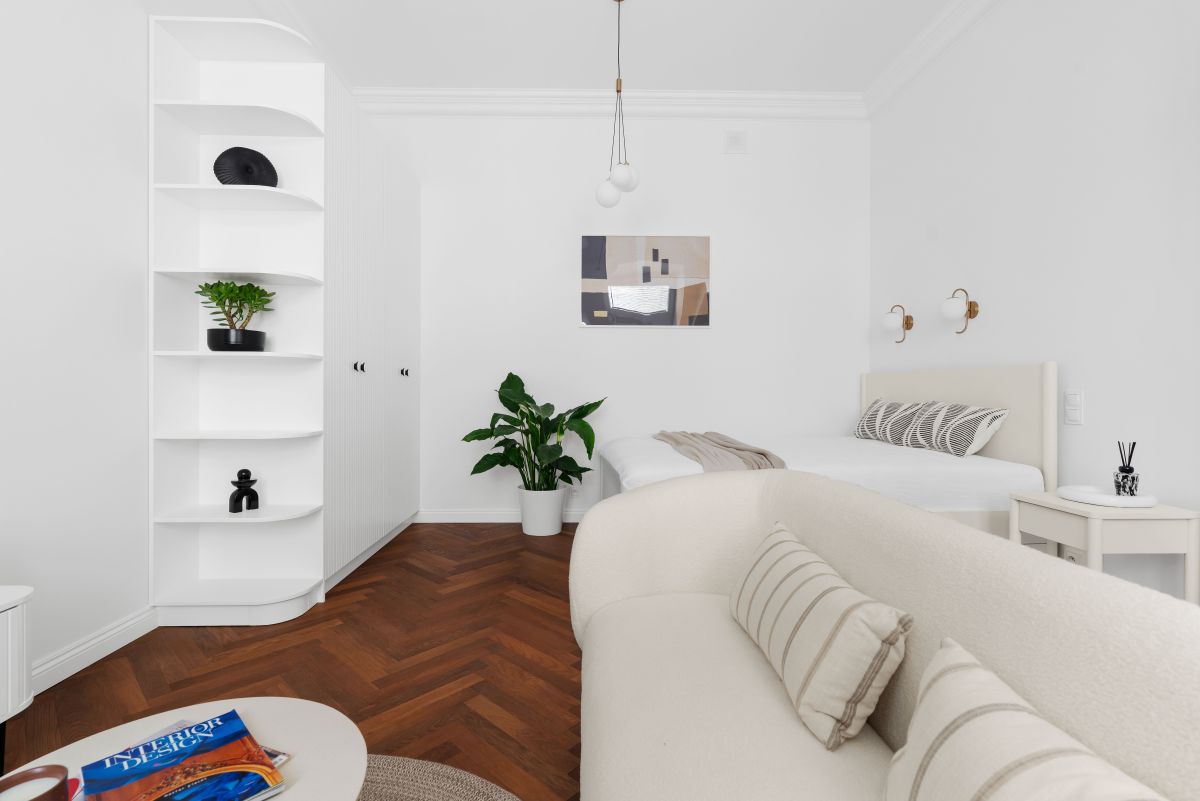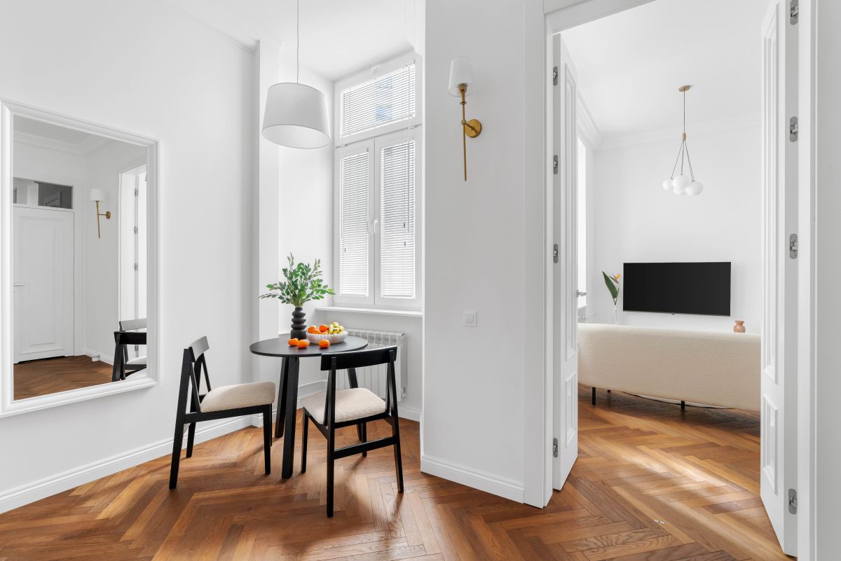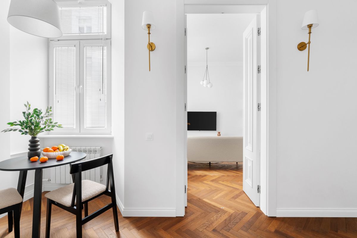Przedwojenne proporcje wnętrz zapewniają poczucie przestrzeni i światła nieosiągalne w nowym budownictwie. Starannie dobrane materiały i spójna aranżacja tworzą eleganckie, ponadczasowe wnętrze — gotowe bez remontu.