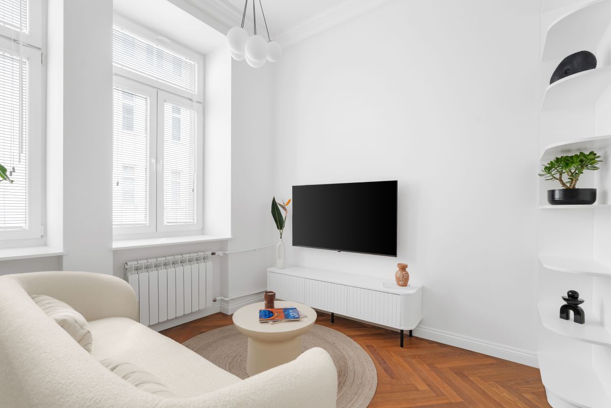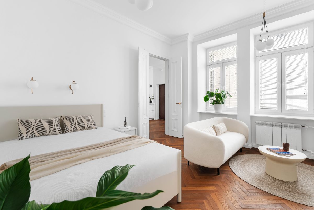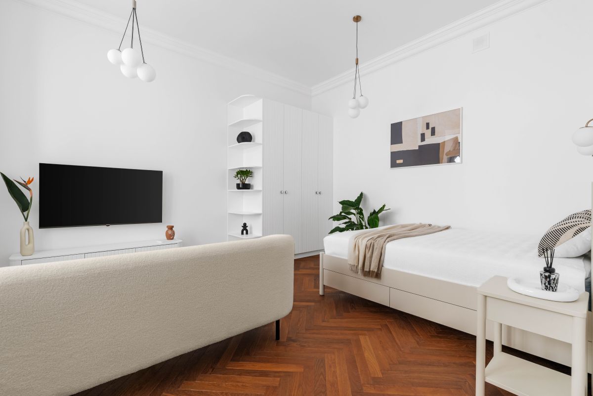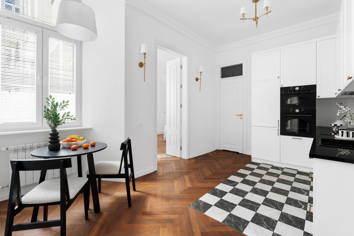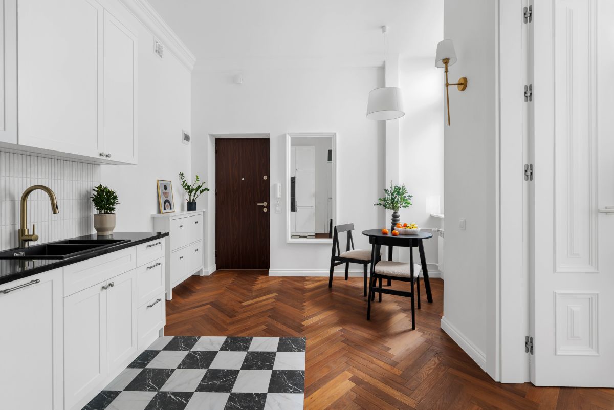 Przedwojenne proporcje wnętrz zapewniają poczucie przestrzeni i światła nieosiągalne w nowym budownictwie. Starannie dobrane materiały i spójna aranżacja tworzą eleganckie, ponadczasowe wnętrze — gotowe bez remontu.