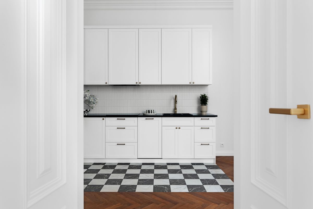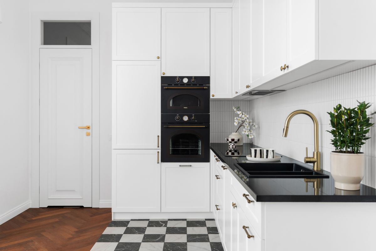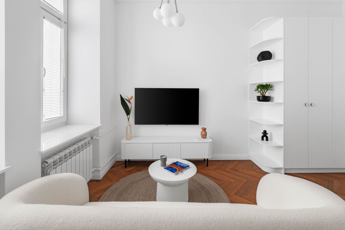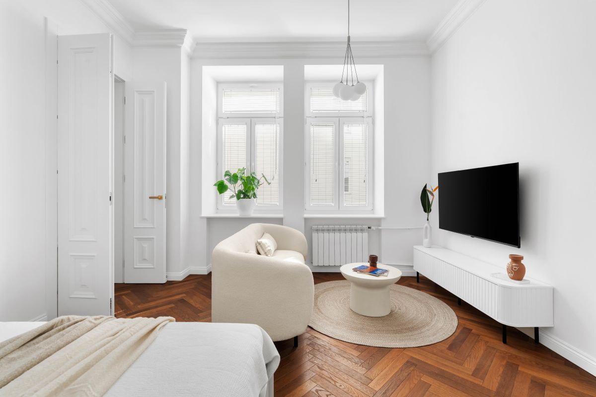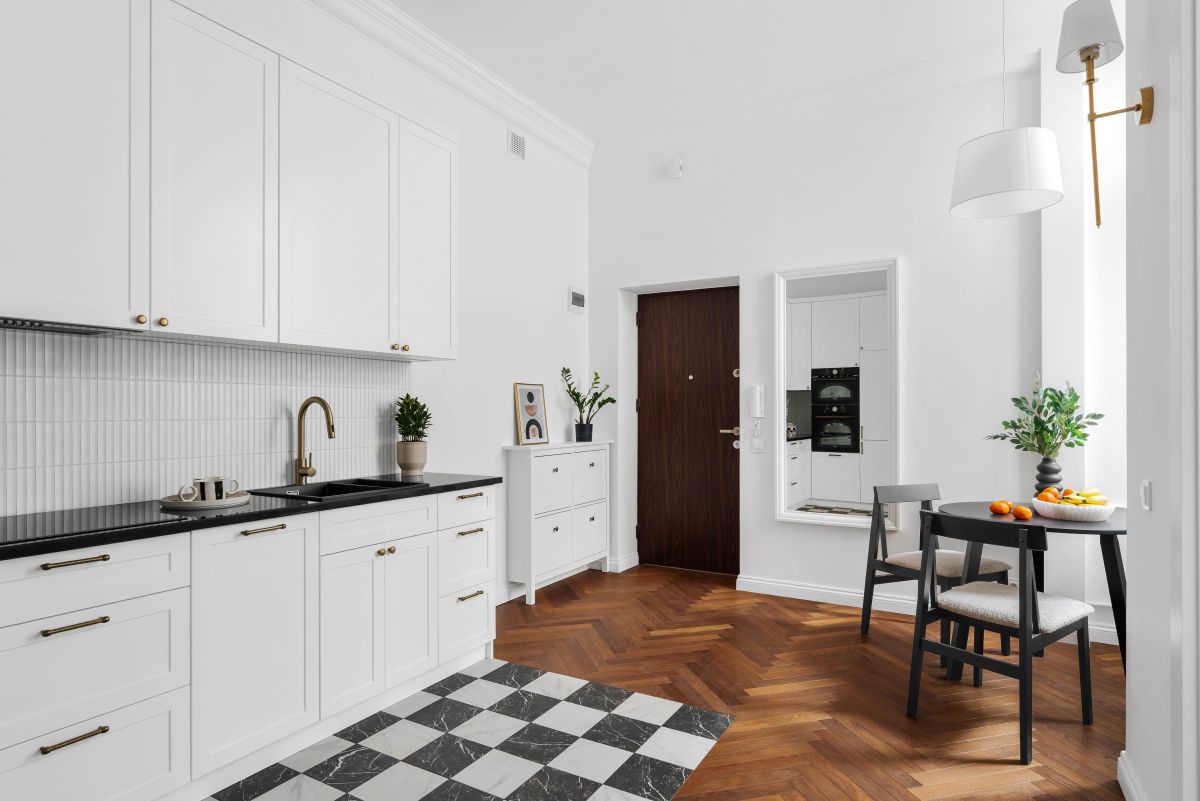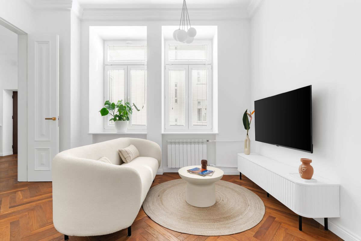 Przedwojenne proporcje wnętrz zapewniają poczucie przestrzeni i światła nieosiągalne w nowym budownictwie. Starannie dobrane materiały i spójna aranżacja tworzą eleganckie, ponadczasowe wnętrze — gotowe bez remontu.